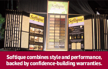 The display also contains two graphic panels that convey the line’s features and benefits. “The whole story can be told at point of sale,” Hardy said. “The features and benefits are so well displayed it will convince her Softique is truly a value in contrast to other products on the floor.” In addition, room scenes inspire the consumer by showing what the carpet can do to a room once it is installed, he said.
