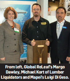 Mapei last month recognized those customers who participated in the American Forests Global ReLeaf program. Luigi Di Geso, president and CEO, Mapei Americas, awarded “golden shovels” to representatives from its top three companies: Lumber Liquidators,