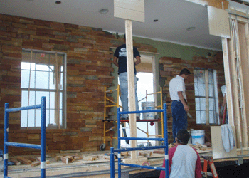 With the increase in the popularity of direct adhered thin-stone masonry veneer facades, LATICRETE addressed the industry-wide need for a suitable system of products and detailed specification with the LATICRETE® MVIS™ installation system. Engineered as an advanced, complete wall system, the LATICRETE MVIS products were used to direct adhere the random drystack pattern of engineered thin-stone tiles in varying sizes from Daltile’s Forth Worth location. Using the stone tiles ranging in size from 1 ½” x 12” to 6” x 6”, volunteer masons used the LATICRETE MVIS specification for the 200 square foot exterior entrance to the house, a smaller interior section on the other side of entrance, as well as the protruding dining room exterior veneer in the back of the house. The LATICRETE MVIS application was also used for the 2 ½’ water table set around the base of the garage with the same series of Daltile thin-stone tiles in random sizes. The LATICRETE MVIS system was installed at Palm Harbor Homes in Forth Worth, loaded onto the back of a flatbed truck and driven all the way to Wellman, near Lubbock, TX. Once the 41’ x 60’ custom modular home arrived some 300 miles later, it was then swung into place via crane on-site.