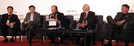 On the panel with Spieler were, from left, Wu Shengfu, director, international department of China National Forest Product Industry Association, who co-moderated the session; Guo Hui, CEO of Power Dekor, one of China’s largest and best known flooring companies; Frederik Dreesman, group manager of Homedecor International, who gave the European perspective, and Robert Banks, executive officer of BuildDirect.