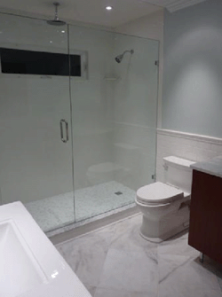 The feature design element, gorgeous white, 18” x 18” natural Carrara marble tiles for the flooring, blended with Ice White 3” x 6” subway tiles on all four walls, complicated from an installers point of view by a 4” wainscot stripe and a chair rail cap to match. By selecting Hakatai’s popular China Blend of ¾” x ¾” glass mosaics, offering soft whites and a softer gray, Ceramictec had found the perfect accent for the subtle gray veining of the primary Carrara Marble field tile. Ceramictec installed the China Blend mosaics on the shower floor, as well as several custom niches inside the glass-encased shower for a smooth, high-design and sleek new master bath.