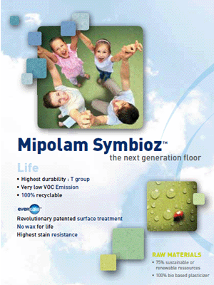 CHICAGO, I.L. – (JUNE 2, 2010) – Gerflor, a global leader in the design and manufacture of specialized resilient flooring, today announced the launch of its new bio-based Mipolam Symbioz vinyl flooring. This homogenous vinyl floor covering is suited for heavy foot traffic areas and contains more than 75% renewable raw materials with a bio-based plasticizer made from grain residues like wheat and corn. Its composition gives way to 40 times lower VOC emissions set by European environmental standards.