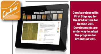 Several companies are utilizing handheld technology to ease the designing, specifying and ordering process. New for NeoCon 2011, Centiva released its iPad app, Centiva First Step, available in the app store through Apple. According to Amanda Teyeb, advertising and Green Way coordinator, the app is an integrated business tool that allows iPad users to search and review flooring products, share their selections with colleagues, and order product samples immediately.