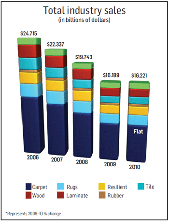 Sales of carpet essentially flattened out in 2010, dropping a miniscule one-half of a percentage point to $7.835 billion. In terms of volume, carpet and rugs combined fell 1.6% to 11.01 billion square feet.
