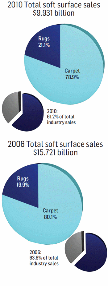 Carpet sales, which still represent 79% of soft surface volume were off by a miniscule $40 million from 2009, representing just a 0.5% drop. Meanwhile, sales of area rugs rose for the first time since 2006, climbing 2.1%.