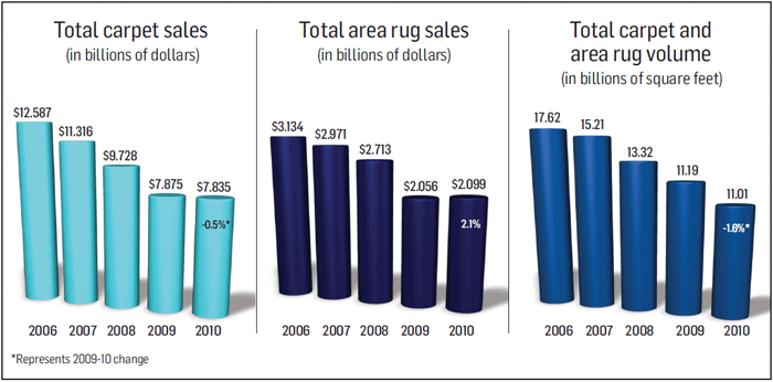 Since 2008, when the recession really took hold of the country, “Flat is the new up” has become the hot catchphrase in business circles across the country. When it came to total sales of carpet and rugs in 2010, the saying could not have been more accurate as the year pretty much mirrored the previous 12 months and put an end to a three-year slide that saw total sales drop nearly 40% since their peak in 2006.