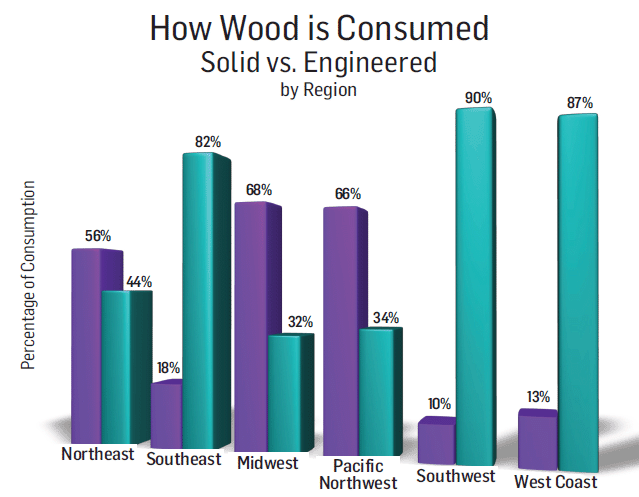 As such, imports in 2010 accounted for one-third of all wood floors sold in 2010. The picture is a little different when just looking at engineered products: imports amounted to 52% of goods sold. Engineered floors as a whole continued to gain share over solid and, in fact, now account for half the wood floors sold in North America.