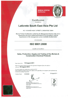 September 29, 2011: LATICRETE, a global manufacturer and leader of premium installation and finishing systems for the building industry, announced today the management system of LATICRETE Southeast Asia Pte Ltd. has been certified to ISO 9001 by Bureau Veritas Certifications.