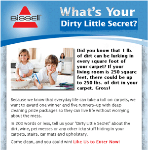 From November 7 - December 2, 2011, consumers can enter BISSELL's "What's Your Dirty Little Secret?" contest for a chance to win cash and prizes. Entrants will submit their carpet and upholstery confessions via BISSELL's Facebook page, and BISSELL will choose one grand prize winner. The grand prize will include a BISSELL Lift-Off® Deep Cleaner for the winner and five family members or friends. In addition, the winner will receive a $2,500 gift card and the full suite of BISSELL Lift-Off® Products, including the Lift-Off® Deep Cleaner, Lift-Off® Multi Cyclonic Pet Vacuum, Lift-Off® Steam Mop and Lift-Off® Floors & More. Five runners-up will also receive the full suite of Lift-Off® products. To enter, visit www.facebook.com/bissell .