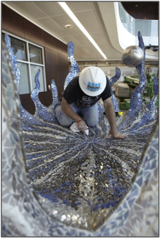 Augusta, Georgia mosaicist, Paul Pearman, won the Juror's Choice Award for his incredibly innovative, multi-tiered chandelier, "The Four Stages of Higher Learning," currently hanging prominently in the lobby area of Georgia Health Sciences University, College of Dental Medicine. Thousands upon thousands of pieces of reflective glass and metal, some extremely minute, were cut with tiny nippers and then bonded via LATICRETE materials to the structure’s “body,” all by hand. In some cases, because the pieces were so small, affixing them to meet the extremely high creative standards of the artist required the use of genuine dental utensils. The final abstract design, which to some is reminiscent of a gigantic jellyfish, has a surface consisting of four separate hanging tiers all covered with an ongoing design incorporating three brilliant colors of both iridescent and non-iridescent glass mosaics.