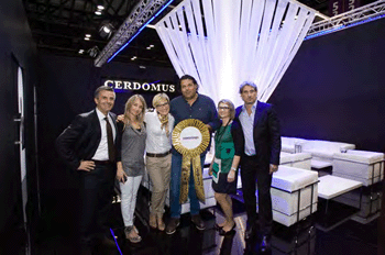Cerdomus received the Overall Best in Show title, winning with a space that enveloped visitors in the drama of black and was supercharged with a hip, club-like ambiance. Its hub was a working lounge of dozens of modern white club chairs where visitors and company representatives could conduct their business in a comfortable, casual setting. The reflective qualities of the brand’s own flooring added to the energy created by the vibrant contrast between the black and white theme. Amid this scene, traditional racks were used for showing the product options. Together with a zone of private conference rooms flanking one wall, the message of this booth was, “Let’s get down to business.”