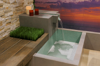 Another growing attraction for attendees has been the Installation Design Showcase. This year’s project was a tour de force of three imaginary room settings where tile was the star material. The design concepts were brought to life by NTCA Five-Star master installers as attendees observed the process first-hand over the course of the show until completion. The resulting settings were jaw dropping. Nationally known Florida-based kitchen designer Joan DesCombes stepped out of her comfort zone into the outdoors to create a pampering patio setting. She was teamed with Cox Tile and Marble, of San Antonio, TX, which faithfully translated her vision, including construction of a working tiled fountain. Orlando native Grant Gribble, ASID, IIDA, partnered with Collins Tile and Stone, Arlington VA, and the outcome was a 70s inspired bath where tile composed into wall art was emphasized. Foreman Rogers, ASID, a senior designer with tvsdesign, Atlanta, stole the show with his boutique hotel guest room. Practiced in hospitality design, having recently completed the Gaylord Palms in Orlando, Rogers was paired with David Allen Company, Raleigh, NC, who met the design challenges, creating a visual treat of unorthodox cuts and skilled applications.