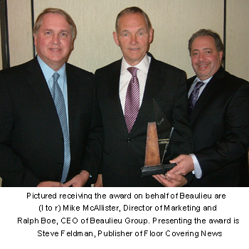 Beaulieu of America received the Award of Excellence for Best Carpet Manufacturer at the recent annual banquet hosted by Floor Covering News magazine based in Hicksville, New York. This is the third year in a row the third largest carpet maker received the honor.