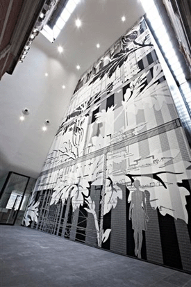 Petra Blaisse’s internationally acclaimed Amsterdam-based design studio Inside Outside has designed a monumental wall hanging of approximately 200 square meters for the Stedelijk Museum Amsterdam. It covers the rear wall of the museum restaurant on the ground floor and rises to a height of 14 meters in the new entrance hall on the Museumplein. The work is sponsored by Dutch carpet manufacturer Desso, which in cooperation with Inside Outside, applied an innovative weaving technique especially for this project.