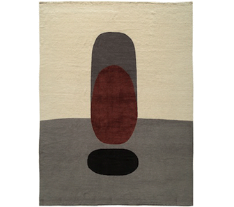 Stonehenge: This design offers a touch of zen mixed with whimsy. Hovering elliptical shapes cast a dark shadow over a grey and ivory ground. The design is made of the finest Himalayan wool with the exception of the burgundy ellipse that boasts a silk and wool tweeding. Handwoven in Nepal at 100 knots per sq. inch.
