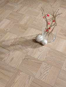 Ash Pearl Grey uniblock flooring comes in 9” x 9” (228.6 x 228.6mm) preassembled square uniblocks that consist of 4 to 6 planks each. Uniblock flooring is milled as solid tongue and groove profile and has a delicate microbevel on all 4 sides. This type of solid wood flooring can be quickly laid into a classic checkerboard pattern using a gluedown method; precision milling guarantees easy and worry-free installation.