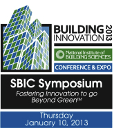 Industry professionals who attend the Sustainable Buildings Industry Council (SBIC) Symposium, to be held Thursday, January 10, 2013, as part of Building Innovation 2013—The National Institute of Building Sciences Annual Conference and Expo in Washington, D.C., can explore what social, economic and environmental sustainability means to various segments of the building industry and how an effective, holistic approach can move the industry Beyond Green™. With the theme Fostering Innovation to go Beyond Green™, the half-day Symposium, scheduled from 8:00 am to 11:45 am, will specifically address this important issue.