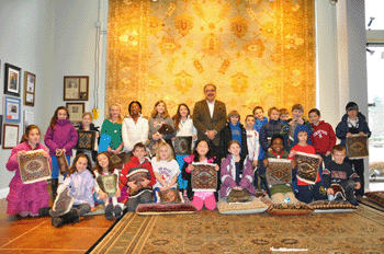 Mahmud Jafri, CEO of Dover Rug & Home, hosted third grade students from the Charles River elementary school on Monday, January 28th for an interactive, educational program on the art of rug making. This educational outreach program, now in it’s 20th year, promotes a better understanding of the Muslim culture and the “story” told by each hand woven rug.