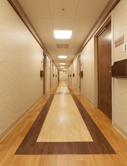 In addition, the overall comfort of this recycled rubber flooring provides improved ergonomics for active patients, residents, and staff. Studies have shown that a more comfortable and content staff results in a better level of patient care. Forest rx is also designed to reduce the risk of injury associated with falls. Force reduction tests have shown fall impact is reduced by 16.9 percent (in accordance with DIN 18032) when Forest rx is installed. This surfacing can also reduce the severity of patient or resident injuries and mitigate liability for the owners of healthcare facilities.