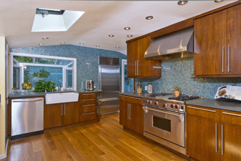 Jimmy Reed didn’t have to work that hard himself to find the perfect materials for the kitchen and bath remodel/makeover. As soon as Jimmy had developed his artistic design concept and finished laying out his meticulous plans, he called on Oceanside Glasstile for the all the kitchen wall surfaces. For the guest bath, Jimmy Reed’s artistic, intricate tile design and layout could only be accomplished by working closely with one company, the handmade tile artisans at Malibu Ceramic Works.