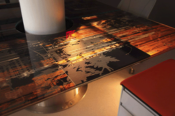 Encode/Decode is a spectacular conference table art piece that is the result of a two-year collaboration between Artist, Shuli Sadé, Dr. André Fenton, Professor at the Center for Neural Science at New York University and Galaxy Glass & Stone®. This 15 x 5 foot conference table which weighed in at a half ton was fully fabricated by Galaxy® and serves as a representation of the state-of-the art understanding of memory and its expression. The Encode/Decode conference table is comprised of 32 photographic panel fragments of a single photograph featuring a New York City nightscape. Also incorporated in the photograph are urban and natural visual textures.