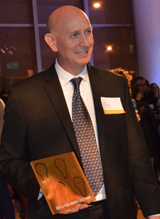 In a special, successful and already event-filled 2013, LUXE Linear Drains president Joe Phillips (right) takes a moment to enjoy his latest piece of hardware as a top finalist in the “Bath Hardware” category at the annual “Best of Year” gala awards ceremony hosted by Interior Design to recognize the top new products and projects of the year on Thursday evening at Frank Gehry’s electric new IAC Building in New York City.