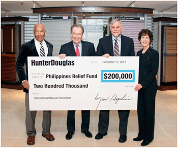 “On behalf of all Hunter Douglas employees in the U.S. and Canada, I am pleased to present this gift to the IRC as they aid in the long-term recovery of the Philippine people from one of the most powerful storms in recorded history,” said Hopkins. “Rated A+ by the American Institute of Philanthropy, the IRC is a highly effective and efficient organization which we have supported in the wake of previous disasters.”