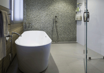 Hammerschmidt Construction’s winning photo features LUXE Linear Drains 100% stainless steel pattern grate drain in a stylish, modern custom bath that incorporates barrier-free, zero-threshold shower entry design. The new shower in this Sunnyvale home outside San Francisco is anchored by a pair of 48” pattern grate LUXE Linear Drains that combine to stretch perfectly across the length of the far back wall below the multi-color mosaic tile design feature. Hammerschmidt Construction’s flawless program also includes stylish, large-format thin porcelain tiles for both the floors and walls. The new bath uses three different styles of tile produced in Spain by PORCELANOSA to create a warm, sophisticated space. The wetroom design is further accented by a gorgeous free-standing tub from Blu Bathworks in Vancouver, Canada.