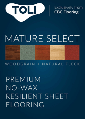 Available exclusively from CBC Flooring, Mature Select premium resilient sheet flooring combines beautifully rendered woodgrain and natural fleck patterns with a patent-pending two-tier, no-wax, antibacterial wear layer that actively resists stains, scuffs, and germs, and a rugged construction that resists tears, gouges, and indentations. Long-lasting and maintenance-free, Mature Select eliminates the expensive, disruptive, and chemical-laden waxing and stripping maintenance required by other commercial sheet flooring, and is made with 26% recycled content, providing high-traffic commercial interiors with an ideal balance of beauty, strength, affordability, environmental responsibility, and durability.