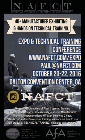 October 20-22, 2016 - National Academy of Floor Covering Training is having its first NAFCT Expo & Technical Training Conference. This is one event you don't want to miss. The National Academy of Floor Covering Training invites you to an unprecedented education opportunity. 45 separate 2 hour classes to choose from over 2 days! Classes presented by the manufacturers Technical Representatives. On the second afternoon a 4 hour trade show with giveaways galore.