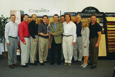 The award was announced during Surfaces 2006 in Las Vegas on Feb. 2. Fuller, Cloer, co-owner Richard Lingle, and Frank Potter, inside sales manager at Capella made the presentation.