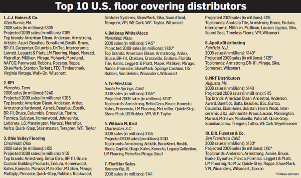 This top-ten list of flooring distributors includes 2008 sales, brands represented.