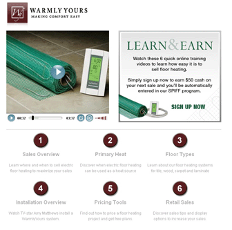 This convenient online training method provides the essentials for selling Electric Floor Heating. Each segment is hosted by a WarmlyYours sales expert and was developed to teach you everything you need to know to increase your floor heating sales.